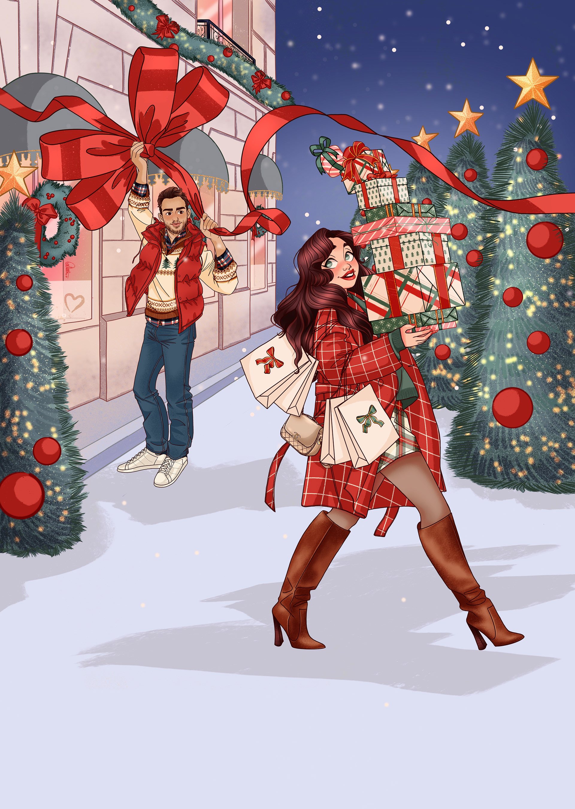 Illustration de la couverture d'un roman, création des personnages, du décor et des éléments de la couverture complète (ruban, petits détails sur la 4eme de couverture)